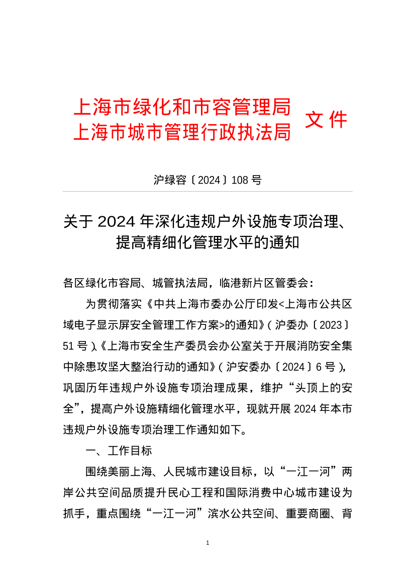 为贯彻落实《中共上海市委办公厅印发<上海市公共区域电子显示屏安全管理工作方案>的通知》(沪委办〔2023〕51号)、《上海市安全生产委员会办公室关于开展消防安全集中除患攻坚大整治行动的通知》(沪安委办〔2024〕6号),巩固历年违规户外设施专项治理成果,维护“头顶上的安全”,提高户外设施精细化管理水平,现就开展 2024年本市违规户外设施专项治理工作通知如下。