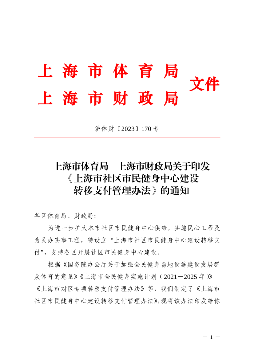 为进一步扩大本市社区市民健身中心供给,实施民心工程及为民办实事工程,特设立“上海市社区市民健身中心建设转移支付”,支持各区开展社区市民健身中心建设。
