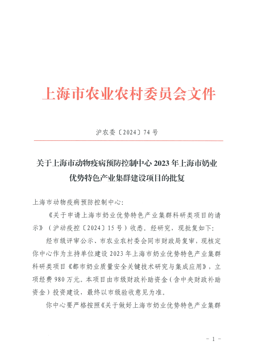 《关于申请上海市奶业优势特色产业集群科研类项目的请示》(沪动疫控〔2024〕15号)收悉。经研究,现批复如下: