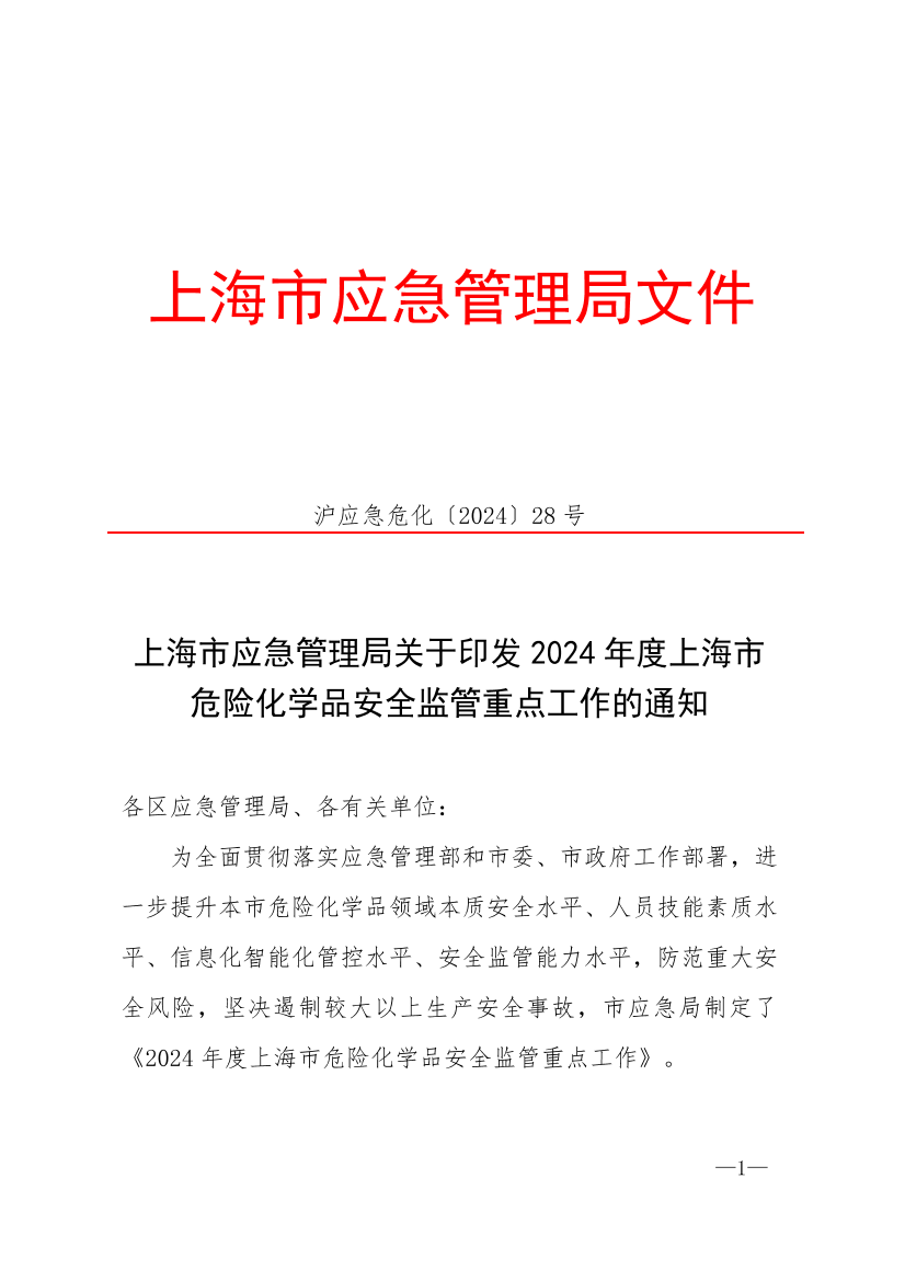 为全面贯彻落实应急管理部和市委、市政府工作部署,进一步提升本市危险化学品领域本质安全水平、人员技能素质水平、信息化智能化管控水平、安全监管能力水平,防范重大安全风险,坚决遏制较大以上生产安全事故,市应急局制定了《2024年度上海市危险化学品安全监管重点工作》。
