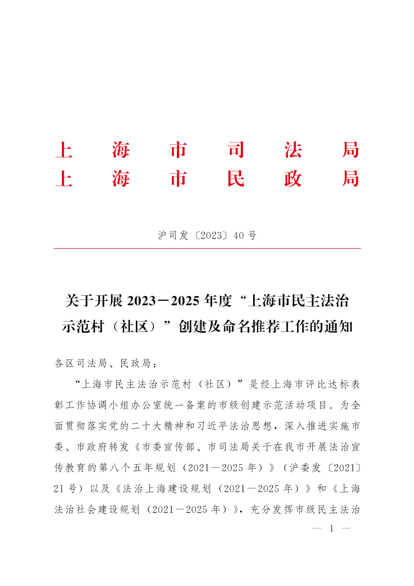 “上海市民主法治示范村(社区)”是经上海市评比达标表彰工作协调小组办公室统一备案的市级创建示范活动项目。为全面贯彻落实党的二十大精神和习近平法治思想,深入推进实施市委、市政府转发《市委宣传部、市司法局关于在我市开展法治宣传教育的第八个五年规划(2021-2025年)》(沪委发〔2021〕21号)以及《法治上海建设规划 (2021-2025年)》和《上海法治社会建设规划(2021-2025年)》,充分发挥市级民主法治示范村(社区)典型示范、引领带动作用,深化我市城乡社区民主法治建设,经研究,现就开展2023-2025年度“上海市民主法治示范村(社区)”创建及命名推荐工作有关事项通知如下: