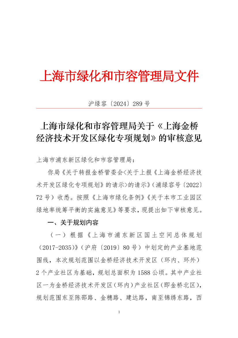 你局《关于转报金桥管委会<关于上报《上海金桥经济技术开发区绿化专项规划》的请示>的请示》(浦绿容号〔2022〕72号)收悉。按照《上海市绿化条例》《关于本市工业园区绿地率统筹平衡的实施意见》等要求,现提出如下审核意见。