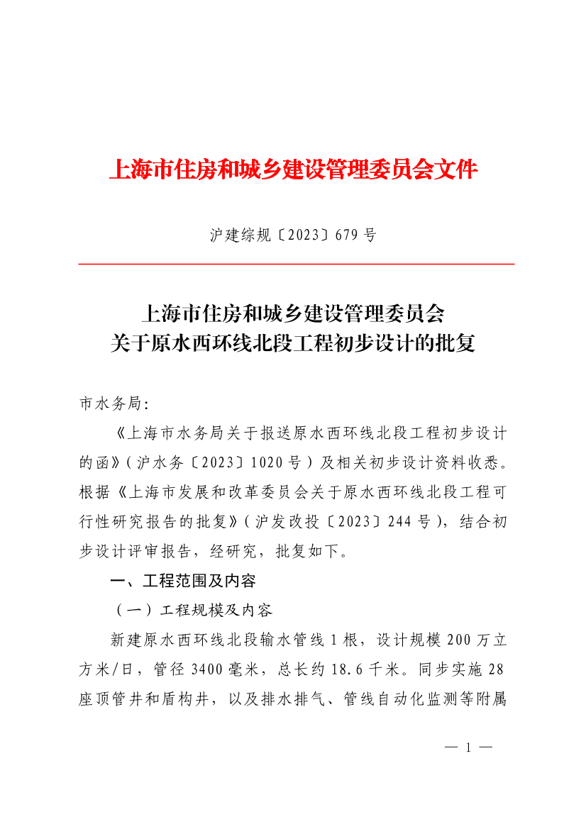 《上海市水务局关于报送原水西环线北段工程初步设计的函》(沪水务〔2023〕1020号)及相关初步设计资料收悉。根据《上海市发展和改革委员会关于原水西环线北段工程可行性研究报告的批复》(沪发改投〔2023〕244号),结合初步设计评审报告,经研究,批复如下。