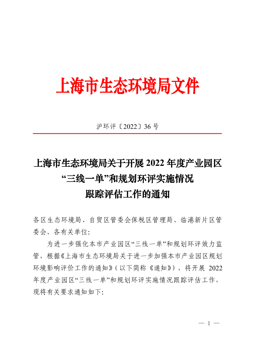 为进一步强化本市产业园区“三线一单”和规划环评效力监管,根据《上海市生态环境局关于进一步加强本市产业园区规划环境影响评价工作的通知》(以下简称《通知》),将开展2022年度产业园区“三线一单”和规划环评实施情况跟踪评估工作,现将有关要求通知如下: