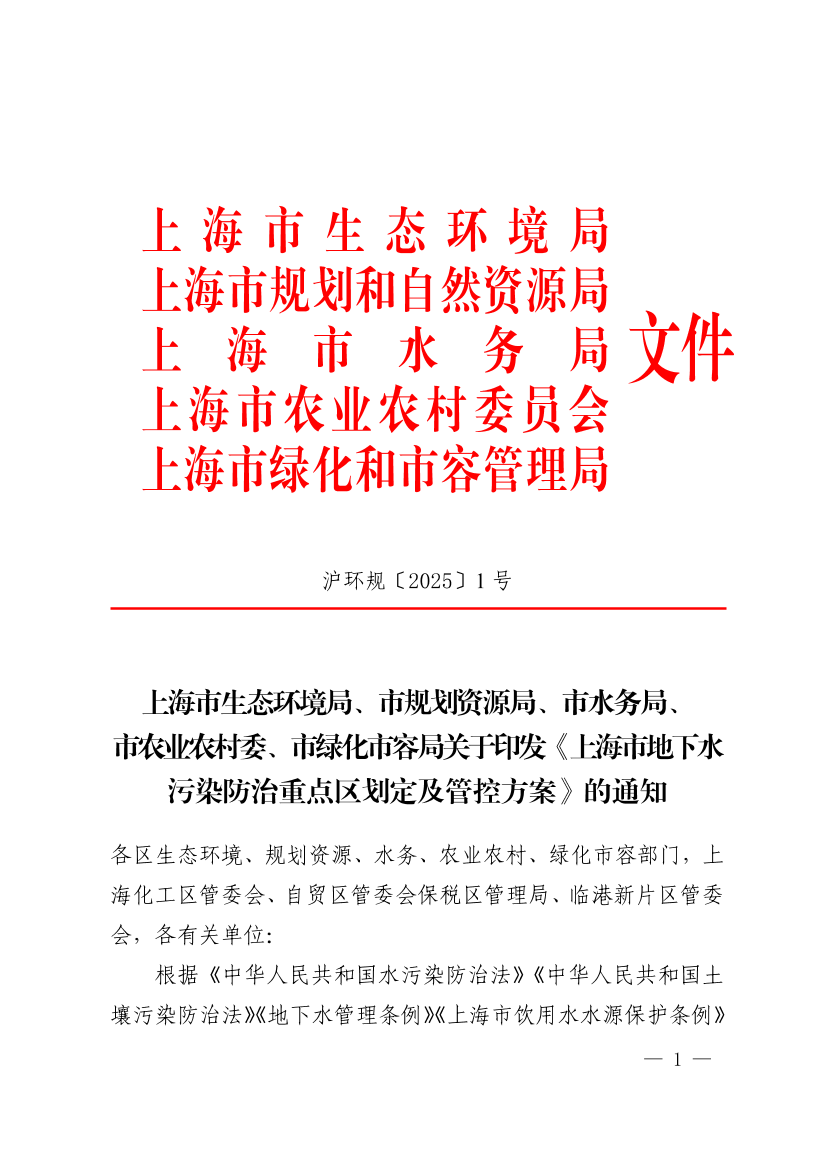 根据《中华人民共和国水污染防治法》《中华人民共和国土壤污染防治法》《地下水管理条例》《上海市饮用水水源保护条例》《上海市土壤污染防治条例》以及《地下水污染防治重点区划定技术指南(试行)》(环办土壤函〔2023〕299号)等有关规定,上海市生态环境局会同市规划资源局、市水务局、市农业农村委、市绿化市容局制定了《上海市地下水污染防治重点区划定及管控方案》,现予印发,请遵照执行。