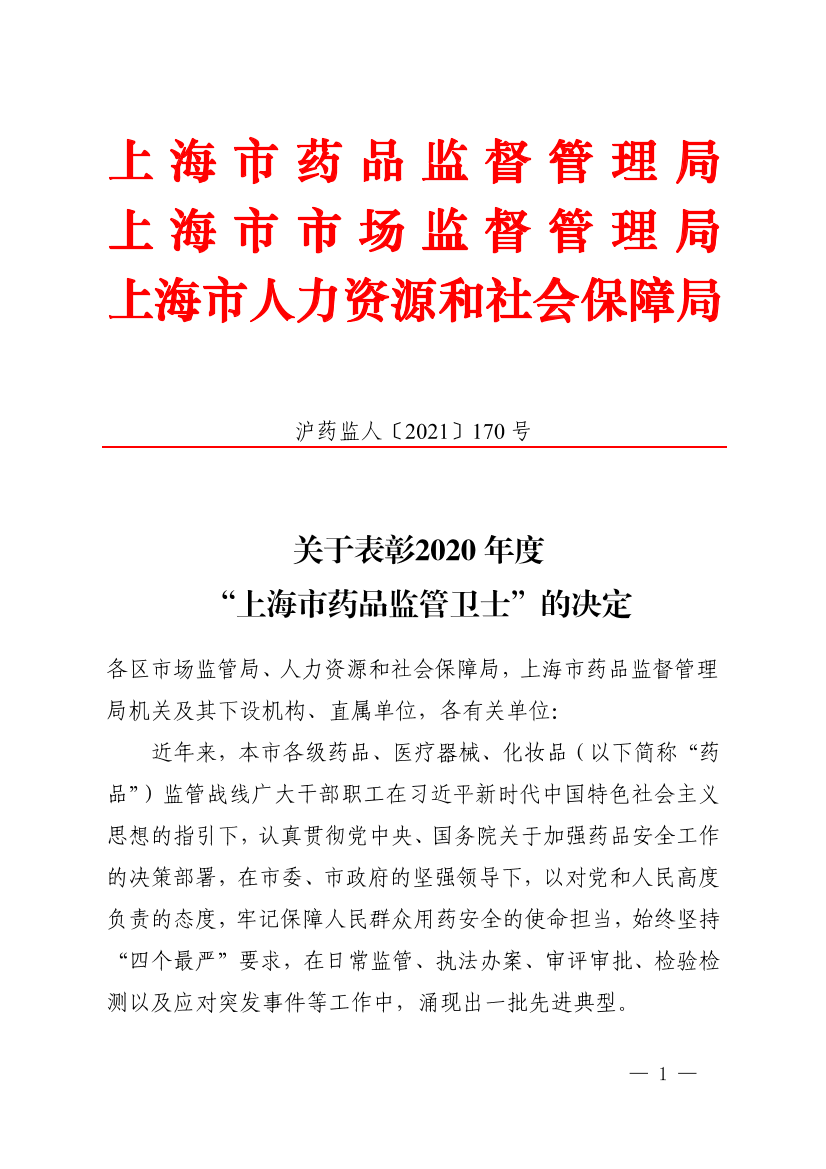 为表彰先进、弘扬正气,进一步激发广大干部职工做好药品监管工作的积极性和创造性,上海市市场监督管理局、上海市药品监督管理局、上海市人力资源和社会保障局决定,授予马秀茜等30名同志“上海市药品监管卫士”称号。