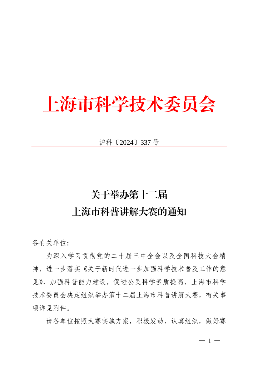 为深入学习贯彻党的二十届三中全会以及全国科技大会精神,进一步落实《关于新时代进一步加强科学技术普及工作的意见》,加强科普能力建设,促进公民科学素质提高,上海市科学技术委员会决定组织举办第十二届上海市科普讲解大赛,有关事项详见附件。
