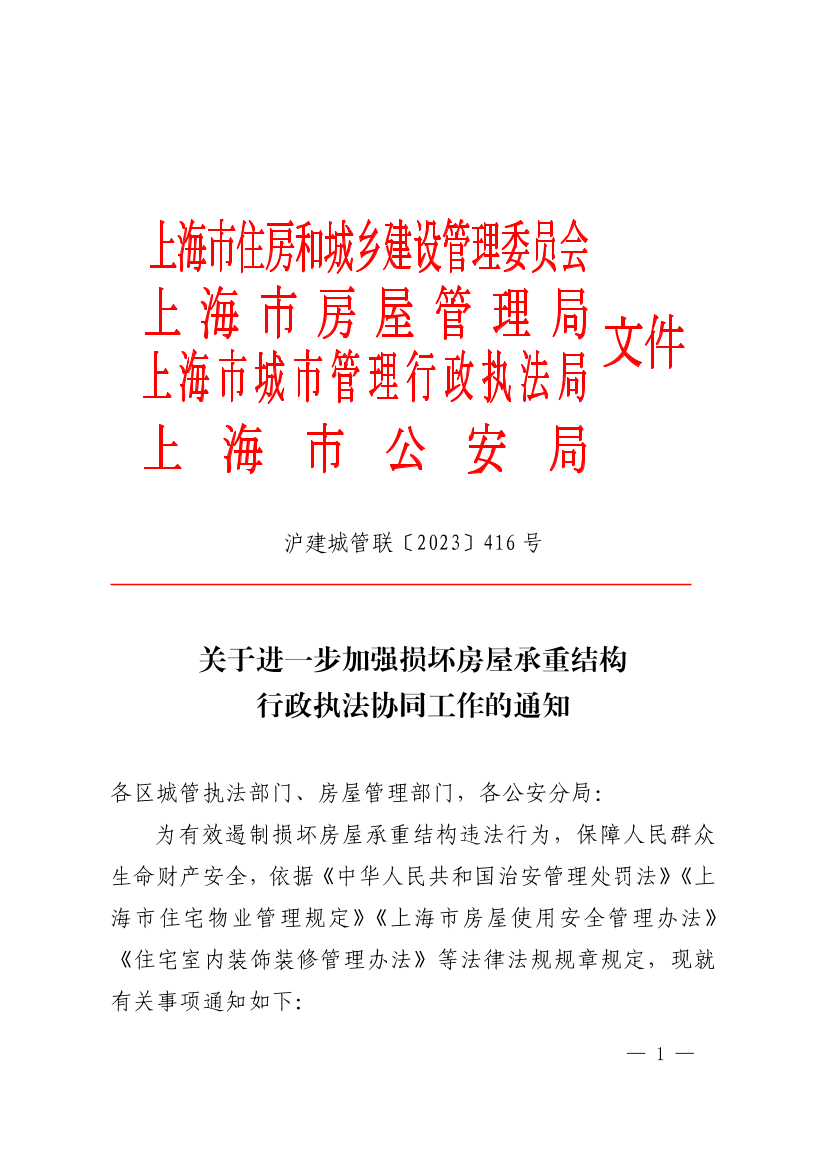 为有效遏制损坏房屋承重结构违法行为,保障人民群众生命财产安全,依据《中华人民共和国治安管理处罚法》《上海市住宅物业管理规定》《上海市房屋使用安全管理办法》《住宅室内装饰装修管理办法》等法律法规规章规定,现就有关事项通知如下: