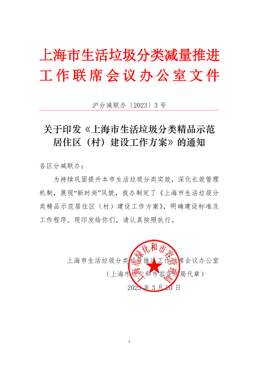 为持续巩固提升本市生活垃圾分类实效,深化长效管理机制,展现“新时尚”风貌,我办制定了《上海市生活垃圾分类精品示范居住区(村)建设工作方案》,明确建设标准及工作程序。现印发给你们,请认真按照执行。