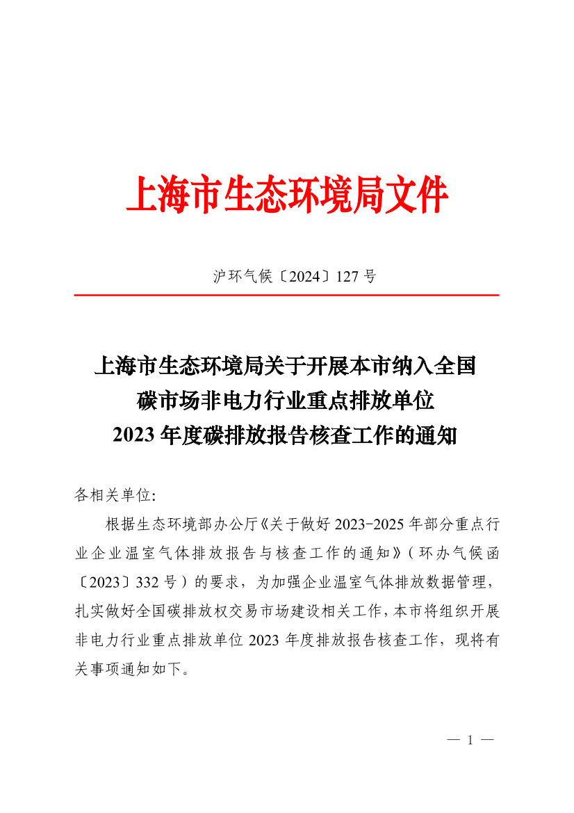 根据生态环境部办公厅《关于做好2023-2025年部分重点行业企业温室气体排放报告与核查工作的通知》(环办气候函〔2023〕332号)的要求,为加强企业温室气体排放数据管理,扎实做好全国碳排放权交易市场建设相关工作,本市将组织开展非电力行业重点排放单位2023年度排放报告核查工作,现将有关事项通知如下。