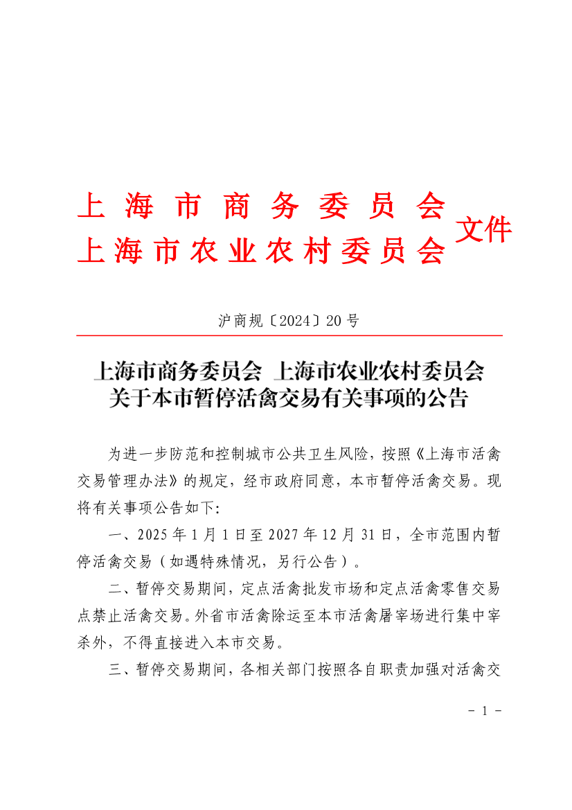 一、2025年1月1日至2027年12月31日,全市范围内暂停活禽交易(如遇特殊情况,另行公告)。