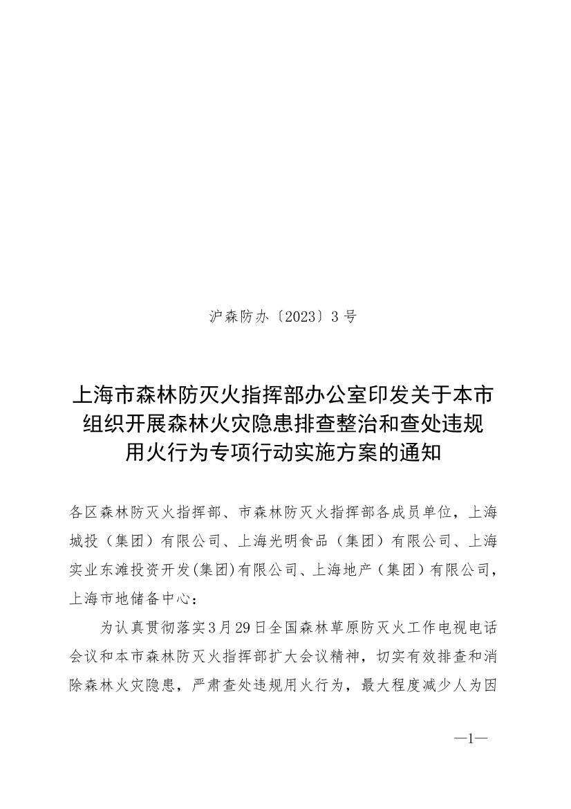各区森林防灭火指挥部、市森林防灭火指挥部各成员单位,上海城投(集团)有限公司、上海光明食品(集团)有限公司、上海实业东滩投资开发(集团)有限公司、上海地产(集团)有限公司,上海市地储备中心:
