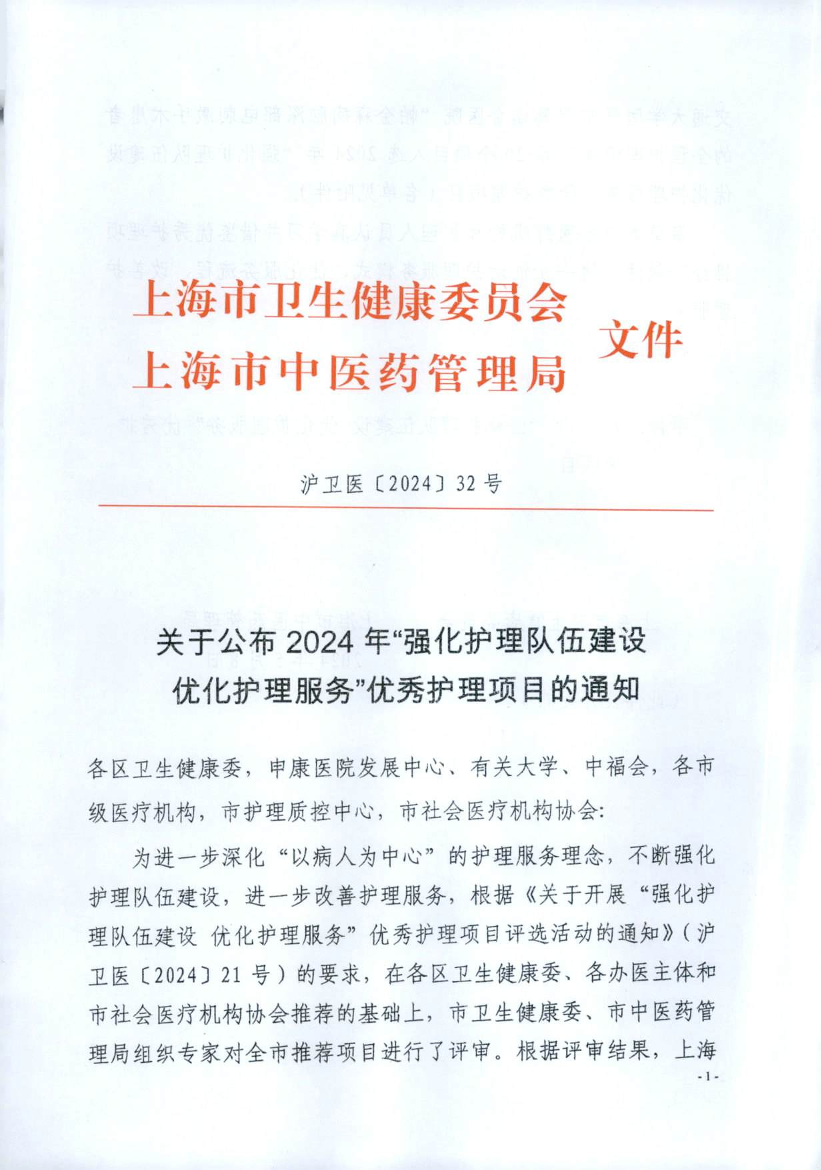 为进一步深化“以病人为中心”的护理服务理念,不断强化护理队伍建设,进一步改善护理服务,根据《关于开展“强化护理队伍建设 优化护理服务”优秀护理项目评选活动的通知》(沪卫医〔2024〕21号)的要求,在各区卫生健康委、各办医主体和市社会医疗机构协会推荐的基础上,市卫生健康委、市中医药管理局组织专家对全市推荐项目进行了评审。根据评审结果,上海交通大学医学院附属瑞金医院“帕金森病脑深部电刺激手术患者的全程护理模式”等20个项目入选2024年“强化护理队伍建设 优化护理服务”优秀护理项目(名单见附件)。