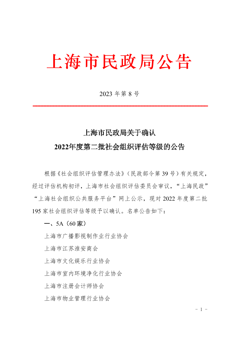 根据《社会组织评估管理办法》(民政部令第39号)有关规定,经过评估机构初评,上海市社会组织评估委员会审议,“上海民政”“上海社会组织公共服务平台”网上公示,现对2022年度第二批195家社会组织评估等级予以确认。名单公告如下: