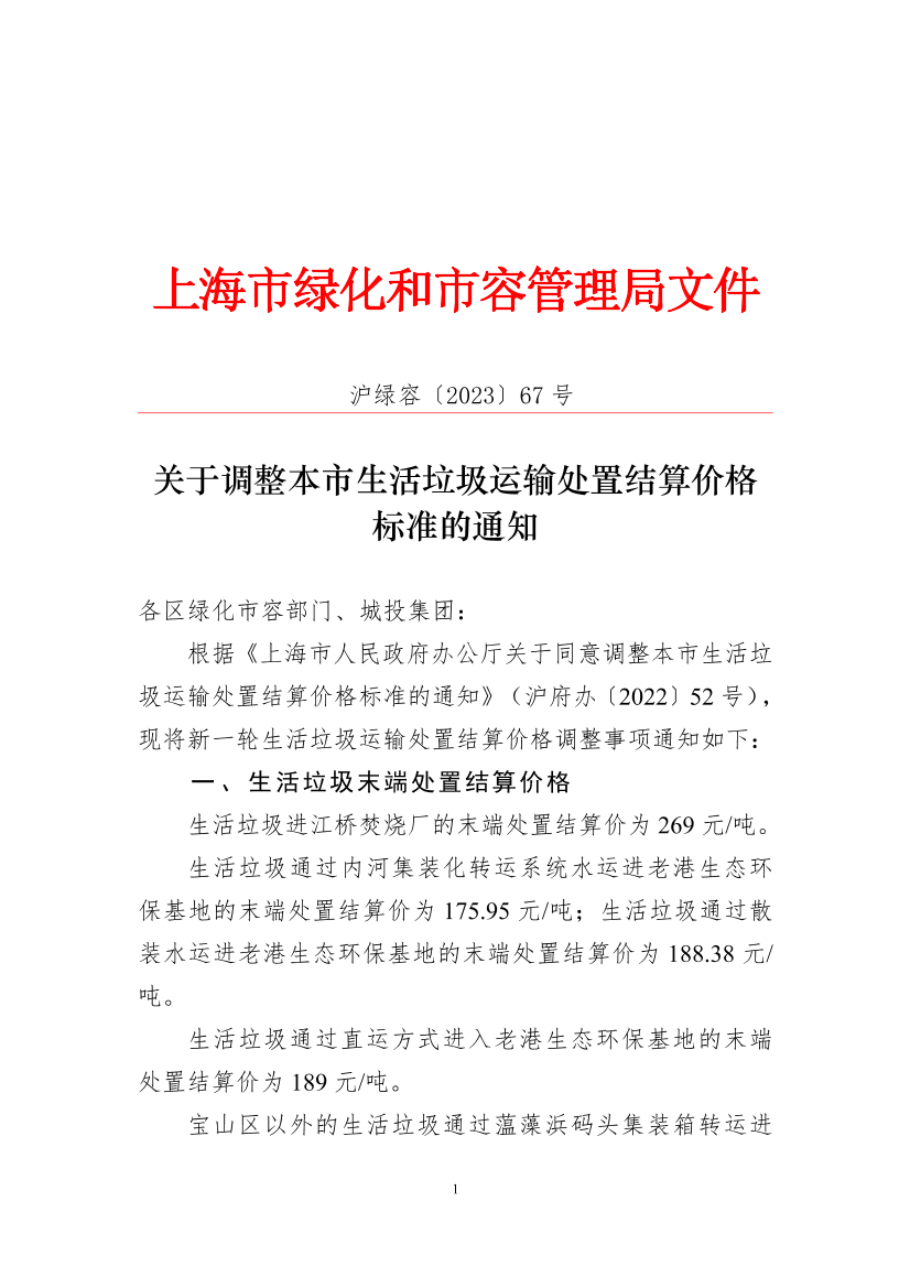 根据《上海市人民政府办公厅关于同意调整本市生活垃圾运输处置结算价格标准的通知》(沪府办〔2022〕52号),现将新一轮生活垃圾运输处置结算价格调整事项通知如下: