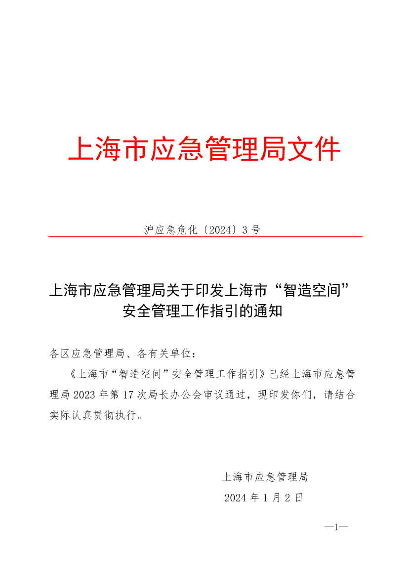 《上海市“智造空间”安全管理工作指引》已经上海市应急管理局2023年第17次局长办公会审议通过,现印发你们,请结合实际认真贯彻执行。