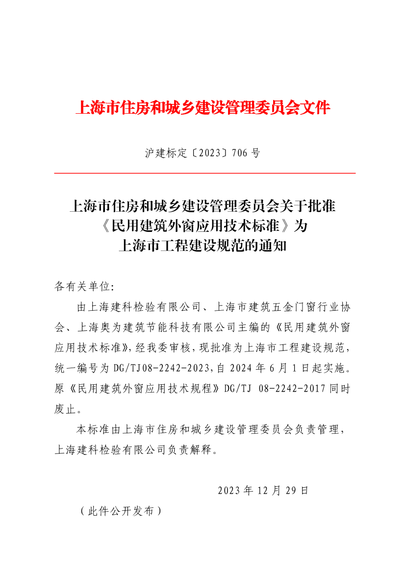 由上海建科检验有限公司、上海市建筑五金门窗行业协会、上海奥为建筑节能科技有限公司主编的《民用建筑外窗应用技术标准》,经我委审核,现批准为上海市工程建设规范,统一编号为DG/TJ08-2242-2023,自2024年6月1日起实施。原《民用建筑外窗应用技术规程》DG/TJ 08-2242-2017同时废止。
