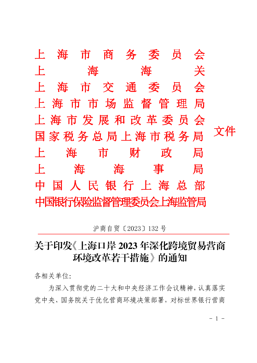 为深入贯彻党的二十大和中央经济工作会议精神,认真落实党中央、国务院关于优化营商环境决策部署,对标世界银行营商环境新评估体系,落实海关总署《2023年促进跨境贸易便利化专项行动部署动员会会议纪要》(署办岸发〔2023〕2号)和《上海市加强集成创新持续优化营商环境行动方案》(沪府办规〔2023〕1号),更大力度提升跨境贸易便利化水平,持续打造市场化、法治化、国际化一流口岸营商环境,市商务委、上海海关、市交通委、市市场监管局、市发展改革委、市税务局、市财政局、上海海事局、中国人民银行上海总部、上海银保监局等单位共同制定了《上海口岸2023年深化跨境贸易营商环境改革若干措施》,现印发给你们,请认真做好组织实施工作。