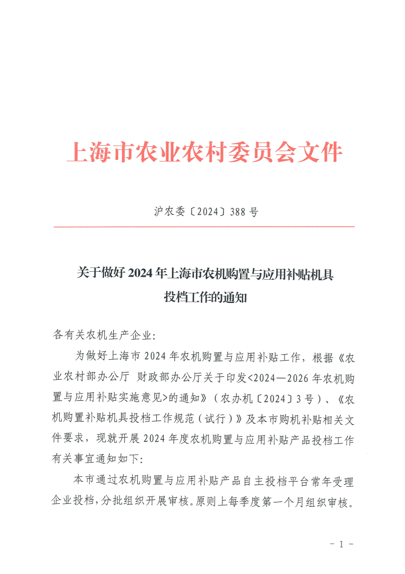 为做好上海市2024年农机购置与应用补贴工作,根据《农业农村部办公厅 财政部办公厅关于印发<2024—2026年农机购置与应用补贴实施意见>的通知》(农办机〔2024〕3号)、《农机购置补贴机具投档工作规范(试行)》及本市购机补贴相关文件要求,现就开展2024年度农机购置与应用补贴产品投档工作有关事宜通知如下: