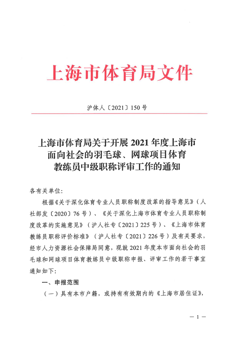 根据《关于深化体育专业人员职称制度改革的指导意见》(人社部发〔2020〕76号)、《关于深化上海市体育专业人员职称制度改革的实施意见》(沪人社专〔2021〕225号)、《上海市体育教练员职称评价标准》(沪人社专〔2021〕226号)及有关要求,经市人力资源社会保障局同意,现就2021年度本市面向社会的羽毛球和网球项目体育教练员中级职称申报、评审工作的若干事宜通知如下: