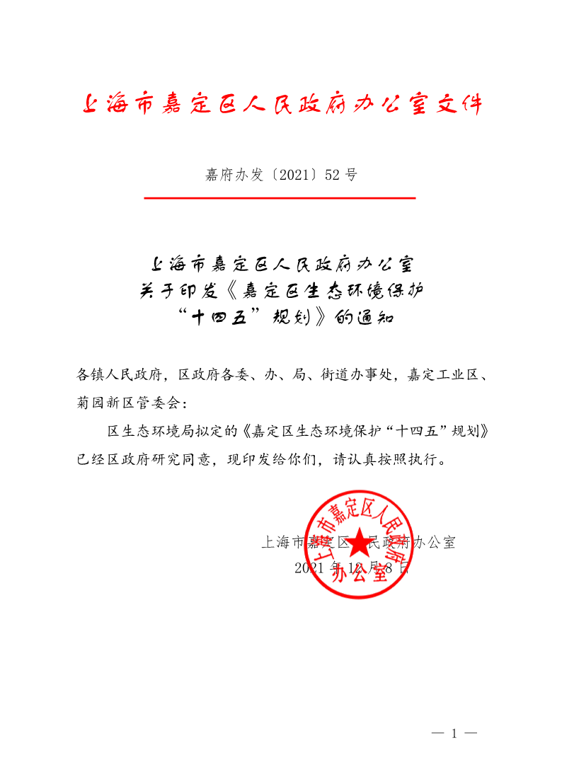 区生态环境局拟定的《嘉定区生态环境保护“十四五”规划》已经区政府研究同意,现印发给你们,请认真按照执行。