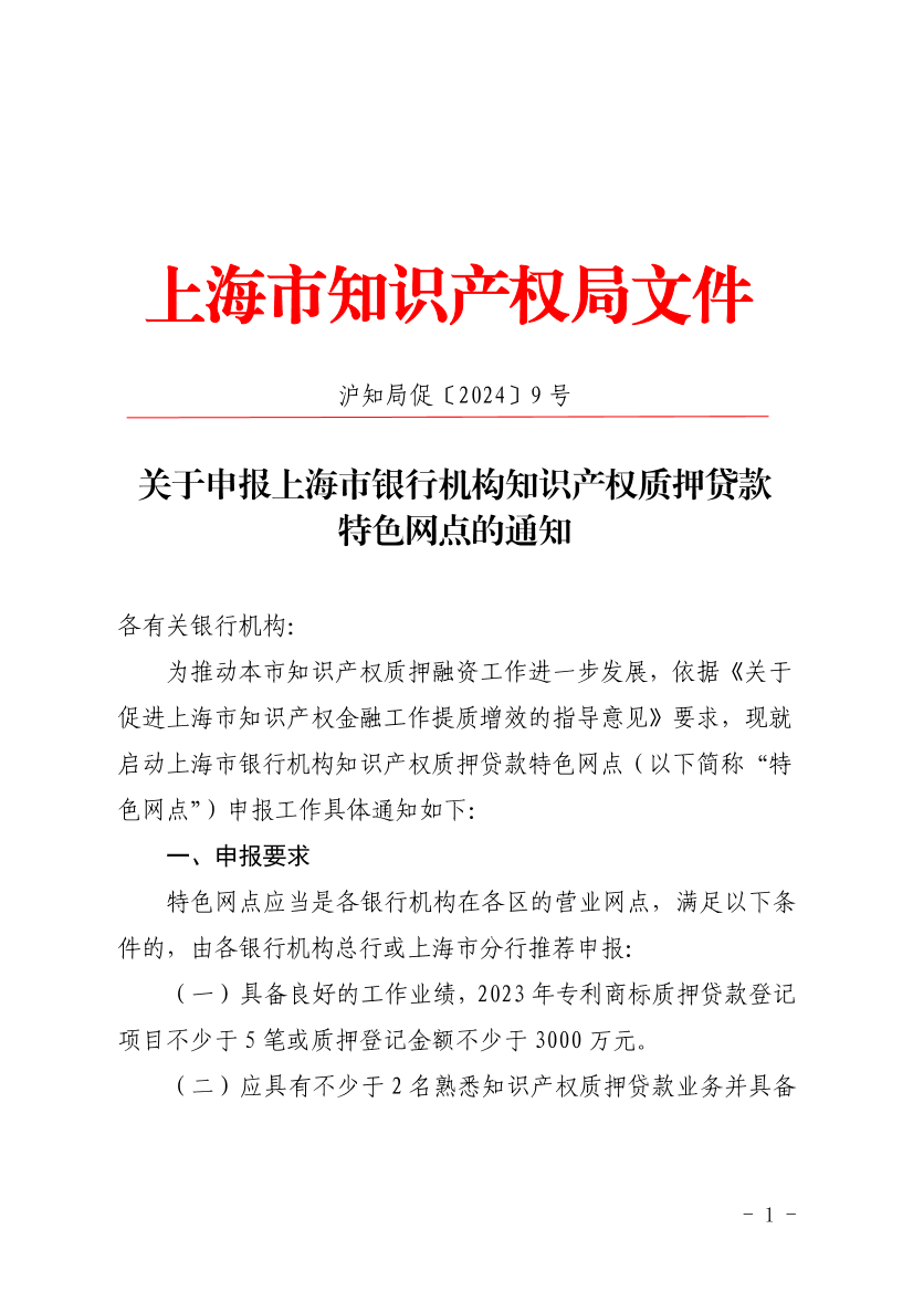 为推动本市知识产权质押融资工作进一步发展,依据《关于促进上海市知识产权金融工作提质增效的指导意见》要求,现就启动上海市银行机构知识产权质押贷款特色网点(以下简称“特色网点”)申报工作具体通知如下: