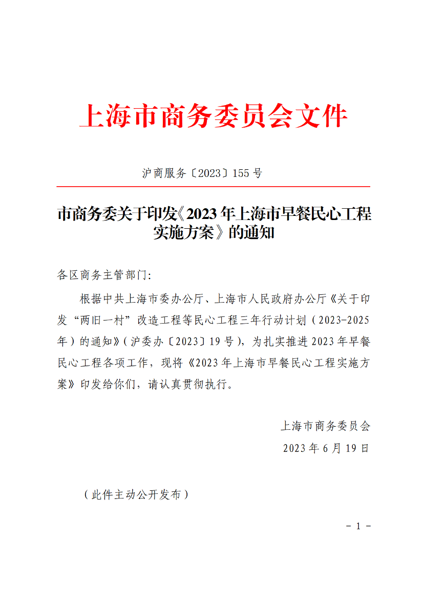 根据中共上海市委办公厅、上海市人民政府办公厅《关于印发“两旧一村”改造工程等民心工程三年行动计划(2023-2025年)的通知》(沪委办〔2023〕19号),为扎实推进2023年早餐民心工程各项工作,现将《2023年上海市早餐民心工程实施方案》印发给你们,请认真贯彻执行。