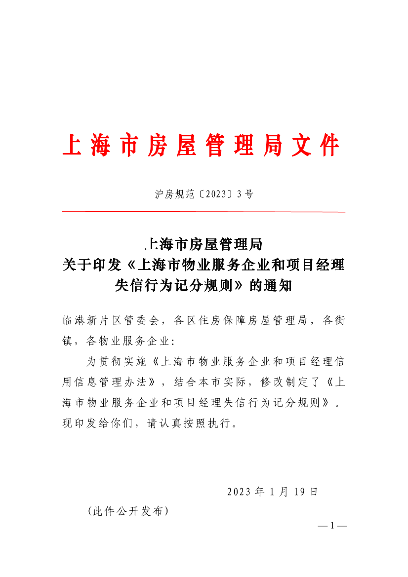 上海市房屋管理局 关于印发《上海市物业服务企业和项目经理失信行为记分规则》的通知
