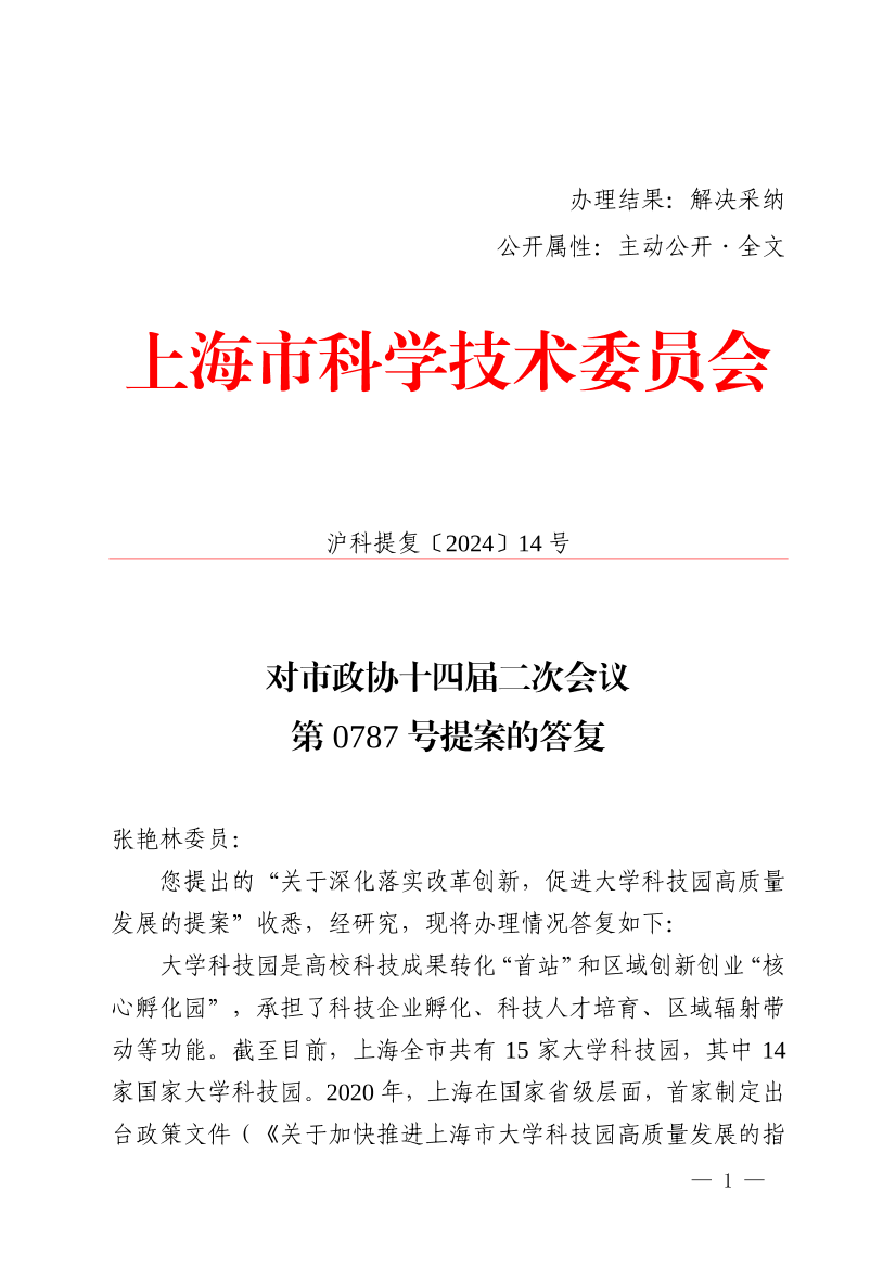 大学科技园是高校科技成果转化“首站”和区域创新创业“核心孵化园”,承担了科技企业孵化、科技人才培育、区域辐射带动等功能。截至目前,上海全市共有15家大学科技园,其中14家国家大学科技园。2020年,上海在国家省级层面,首家制定出台政策文件(《关于加快推进上海市大学科技园高质量发展的指导意见》),取得了积极的成效;2023年年末,又制定出台《上海市大学科技园改革发展行动方案》(以下简称《行动方案》),提出了深化高校体制机制改革、强化大学科技园专业化建设、加快创新资源要素集聚、改革优化考核评价等四大任务。您的提案从当前存在问题研判出发,提出了针对性的建议举措,对于《行动方案》的细化实施、推动部署大学科技园改革发展试点工作,具有宝贵的借鉴意义。