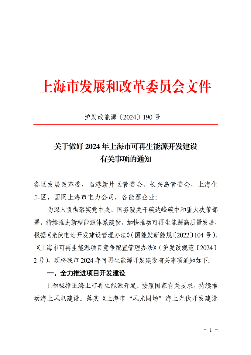 为深入贯彻落实党中央、国务院关于碳达峰碳中和重大决策部署,持续推进新型能源体系建设,加快推动可再生能源高质量发展,根据《光伏电站开发建设管理办法》(国能发新能规〔2022〕104号)、《上海市可再生能源项目竞争配置管理办法》(沪发改规范〔2024〕2号),现将我市2024年可再生能源开发建设有关事项通知如下: