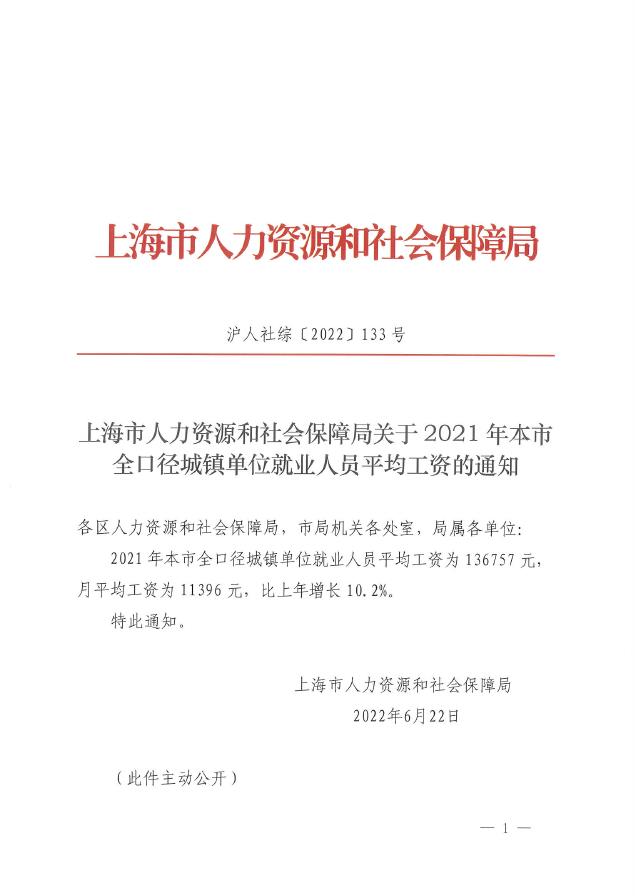 2021年本市全口径城镇单位就业人员平均工资为136757元,月平均工资为11396元,比上年增长10.2%。