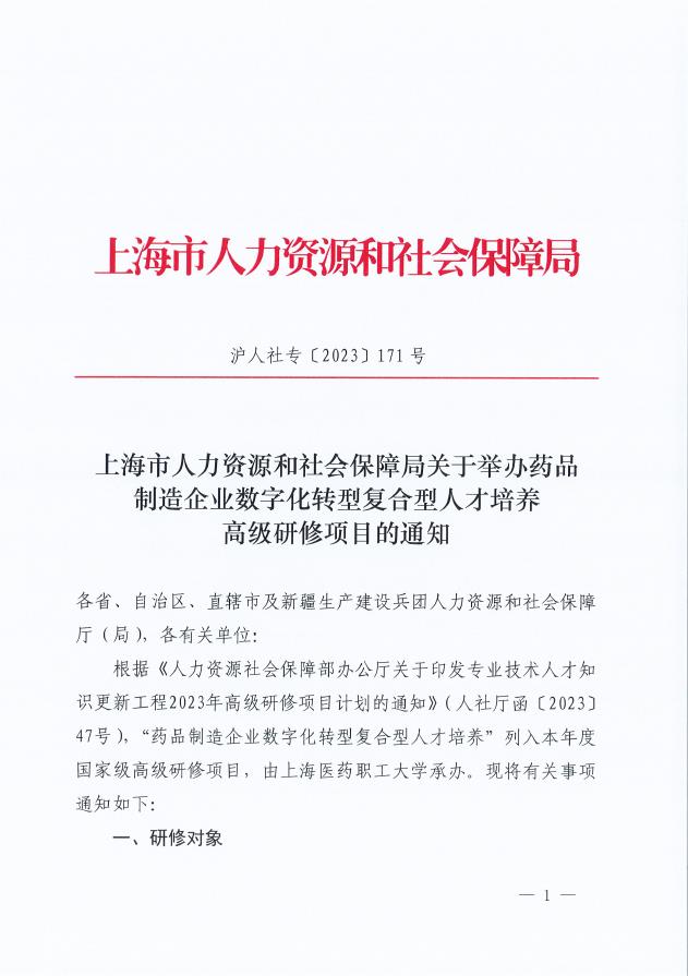 根据《人力资源社会保障部办公厅关于印发专业技术人才知识更新工程2023年高级研修项目计划的通知》(人社厅函〔2023〕47号),“药品制造企业数字化转型复合型人才培养”列入本年度国家级高级研修项目,由上海医药职工大学承办。现将有关事项通知如下: