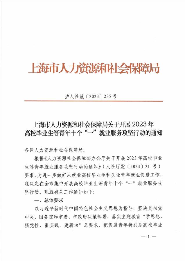 根据《人力资源社会保障部办公厅关于开展2023年高校毕业生等青年就业服务攻坚行动的通知》(人社厅发〔2023〕21号)要求,为进一步做好未就业高校毕业生和失业青年就业促进工作,现决定在全市集中开展高校毕业生等青年十个“一”就业服务攻坚行动。现就有关工作通知如下:
