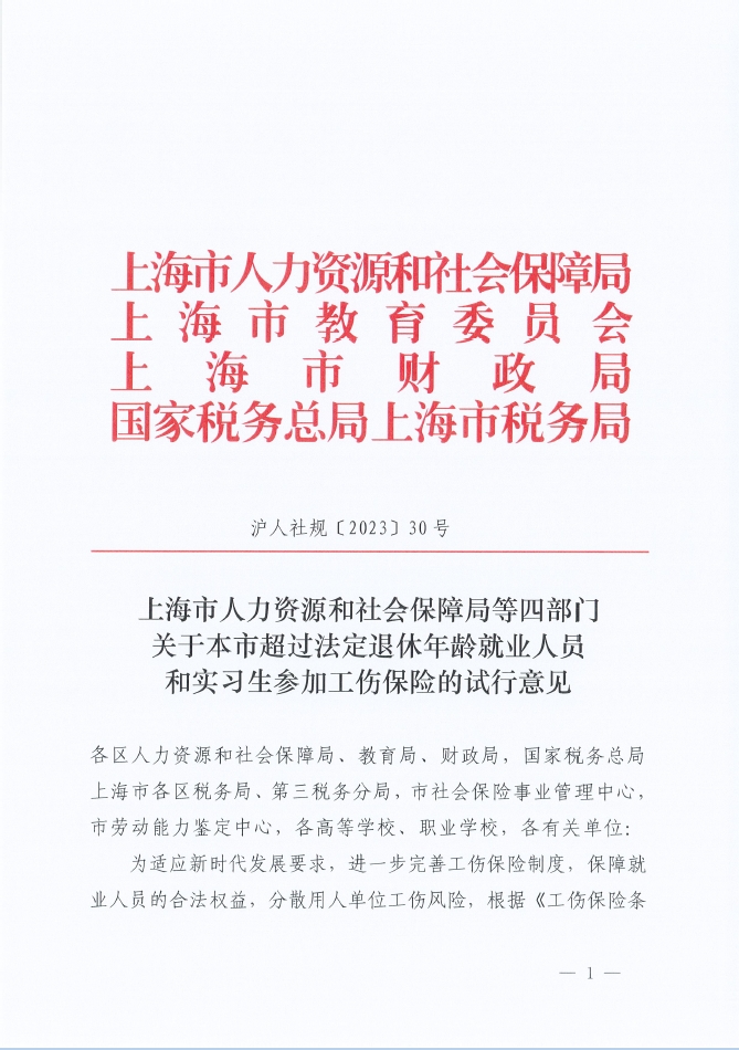 为适应新时代发展要求,进一步完善工伤保险制度,保障就业人员的合法权益,分散用人单位工伤风险,根据《工伤保险条例》《上海市工伤保险实施办法》,结合本市实际,现就本市超过法定退休年龄就业人员(以下简称“超龄就业人员”)和实习生参加工伤保险提出如下试行意见: