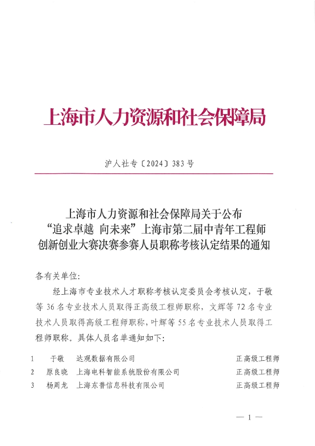 经上海市专业技术人才职称考核认定委员会考核认定,于敬等36名专业技术人员取得正高级工程师职称,文辉等72名专业技术人员取得高级工程师职称,叶辉等55名专业技术人员取得工程师职称。具体人员名单通知如下: