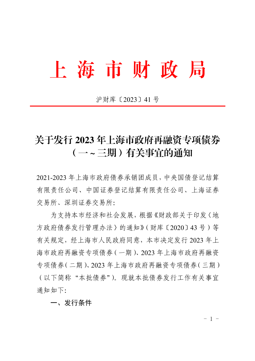 为支持本市经济和社会发展,根据《财政部关于印发〈地方政府债券发行管理办法〉的通知》(财库〔2020〕43号)等有关规定,经上海市人民政府同意,本市决定发行2023年上海市政府再融资专项债券(一期)、2023年上海市政府再融资专项债券(二期)、2023年上海市政府再融资专项债券(三期)(以下简称“本批债券”)。现就本批债券发行工作有关事宜通知如下:
