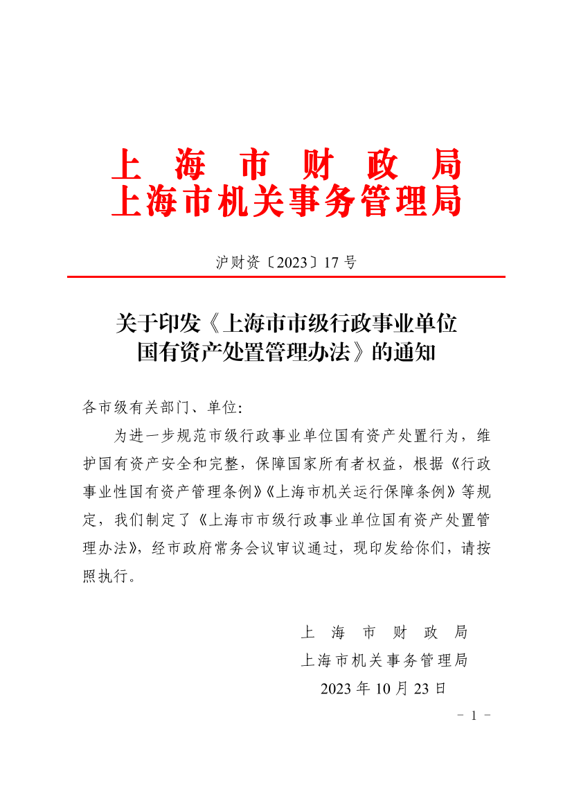 为进一步规范市级行政事业单位国有资产处置行为,维护国有资产安全和完整,保障国家所有者权益,根据《行政事业性国有资产管理条例》《上海市机关运行保障条例》等规定,我们制定了《上海市市级行政事业单位国有资产处置管理办法》,经市政府常务会议审议通过,现印发给你们,请按照执行。