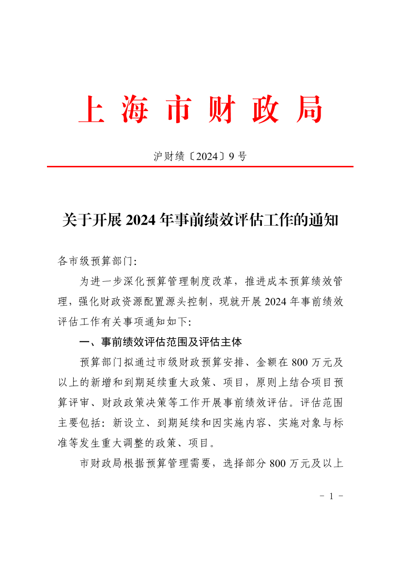为进一步深化预算管理制度改革,推进成本预算绩效管理,强化财政资源配置源头控制,现就开展2024年事前绩效评估工作有关事项通知如下:
