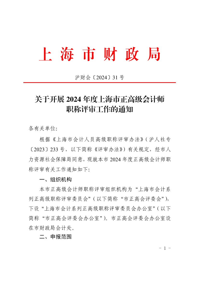 根据《上海市会计人员高级职称评审办法》(沪人社专〔2023〕233号,以下简称《评审办法》)有关规定,经市人力资源社会保障局同意,现就本市2024年度正高级会计师职称评审有关工作通知如下: