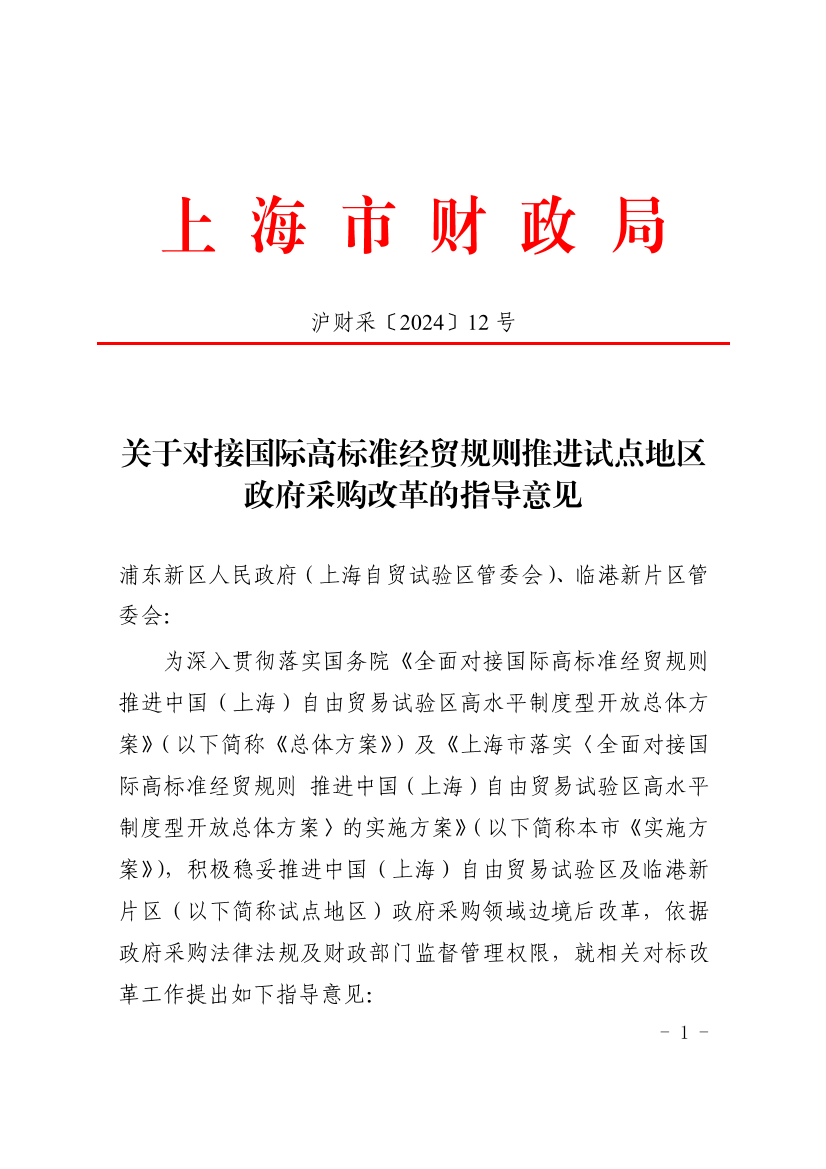 为深入贯彻落实国务院《全面对接国际高标准经贸规则 推进中国(上海)自由贸易试验区高水平制度型开放总体方案》(以下简称《总体方案》)及《上海市落实〈全面对接国际高标准经贸规则 推进中国(上海)自由贸易试验区高水平制度型开放总体方案〉的实施方案》(以下简称本市《实施方案》),积极稳妥推进中国(上海)自由贸易试验区及临港新片区(以下简称试点地区)政府采购领域边境后改革,依据政府采购法律法规及财政部门监督管理权限,就相关对标改革工作提出如下指导意见: