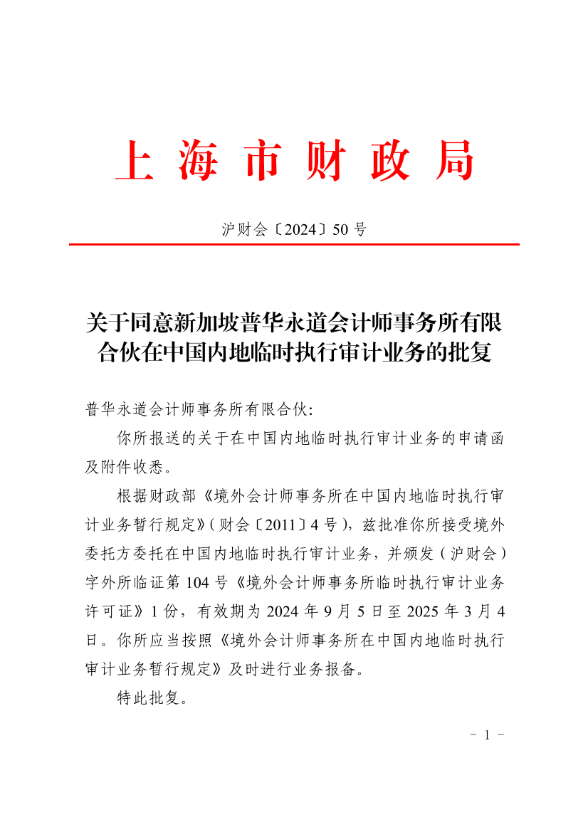 根据财政部《境外会计师事务所在中国内地临时执行审计业务暂行规定》(财会〔2011〕4号),兹批准你所接受境外委托方委托在中国内地临时执行审计业务,并颁发(沪财会)字外所临证第104号《境外会计师事务所临时执行审计业务许可证》1份,有效期为2024年9月5日至2025年3月4日。你所应当按照《境外会计师事务所在中国内地临时执行审计业务暂行规定》及时进行业务报备。