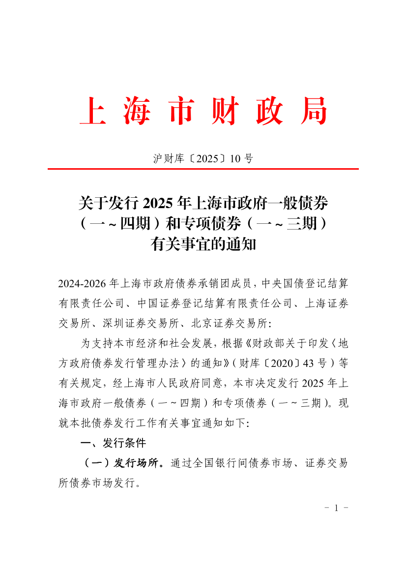 为支持本市经济和社会发展,根据《财政部关于印发〈地方政府债券发行管理办法〉的通知》(财库〔2020〕43号)等有关规定,经上海市人民政府同意,本市决定发行2025年上海市政府一般债券(一~四期)和专项债券(一~三期)。现就本批债券发行工作有关事宜通知如下: