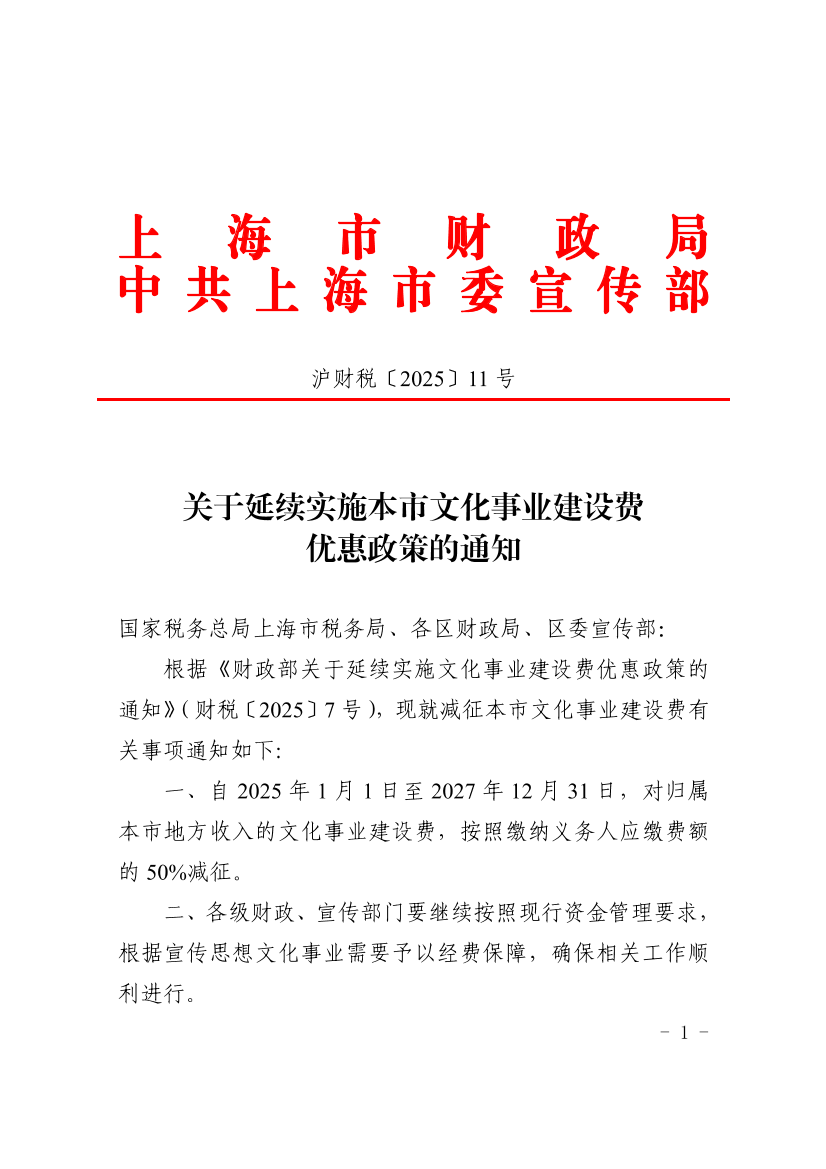 根据《财政部关于延续实施文化事业建设费优惠政策的通知》(财税〔2025〕7号),现就减征本市文化事业建设费有关事项通知如下: