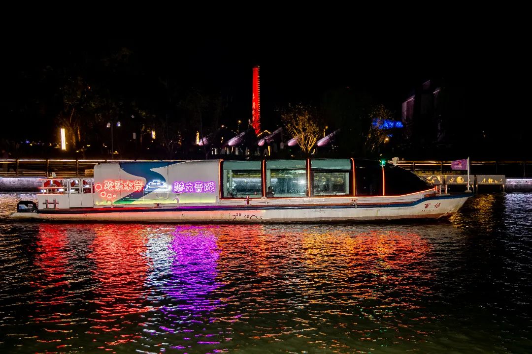 同时,苏州河游船项目全面上新。国庆期间,4艘装扮有上海旅游节和“半马苏河”文化旅游节相关图文的“时光之梭”游船,在夜幕下的长风公园码头和昌化路码头来回穿梭,犹如一条炫彩的荧光飘带吸引了众多市民游客的目光。同时,苏州河游船夜间航线也正式启航。光影节期间,苏州河上的每一处亮灯点位都化作了梦幻的景致。游客沿途可以看到环球港、长风公园码头等点位的光影秀,光影交错,跟水景相得益彰,仿佛置身于一幅流动的光影画卷之中,古老与现代、传统与创新在这里完美交融。