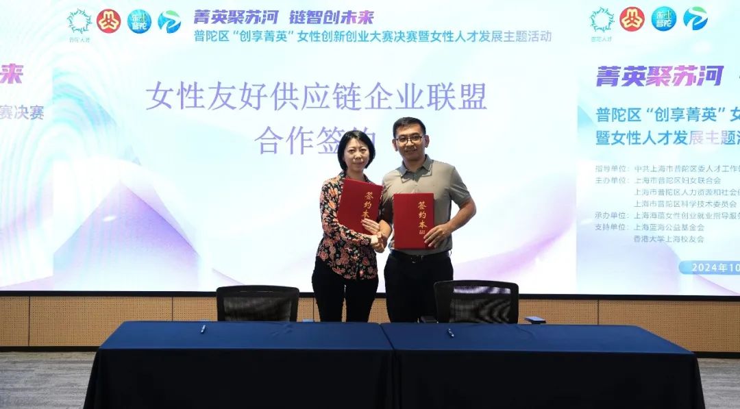 现场,上海市普陀区妇联与江西省九江市妇联共建签约,进一步加强两地妇联组织之间的沟通与协作,共同探索创新妇女工作的方法和途径,推动两地妇女儿童事业的发展。普陀区“女性友好供应链企业联盟”正式成立,将更好地整合资源,为女性创业者们提供全面的支持。现场区内五家企业分别与本次大赛的四个项目达成合作意向,并签订了合作协议。