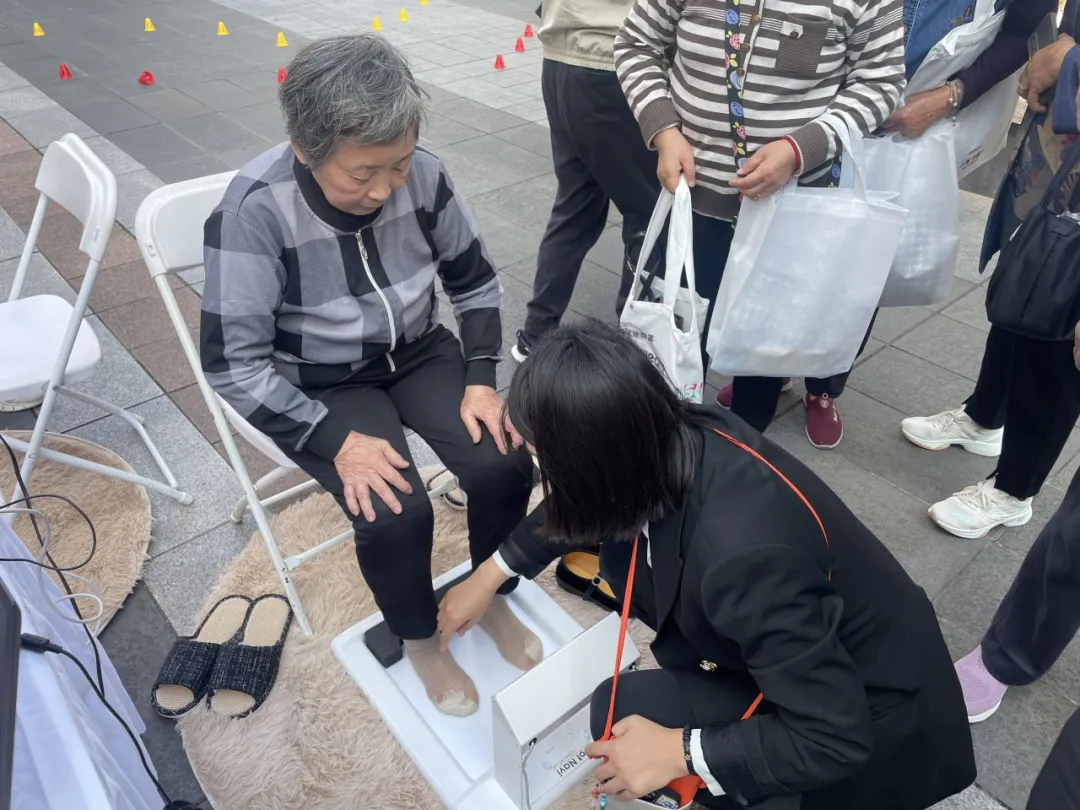 另一边的免费健康测量区域配备了血压计、血糖仪、足部压力测试等,为老人们提供全方位的健康检测。测量完成后,工作人员会耐心地给每位老人个性化的建议。比如血压高一点的老人:“阿姨,您的血压有点偏高,记得少盐少油,平时可以多做做散步运动。”足部压力测试帮助老人诊断是否有拇指外翻、扁平足、高足弓等问题,定制适合自身脚型的老年功能鞋,推荐老人穿上更轻巧、防滑、减震的鞋子。