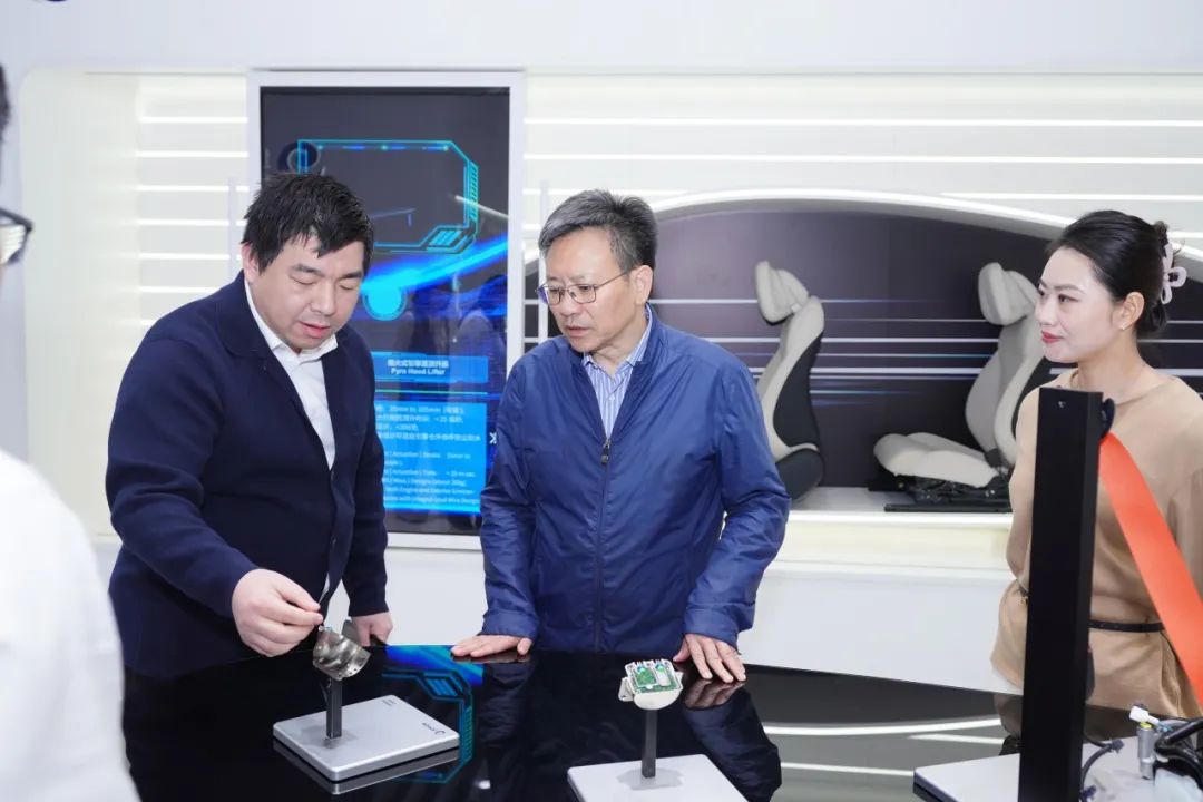 在均胜集团,陈华文一行参观了企业的电子展厅,听取相关负责人讲解发展历程、业务布局、主要产品及优势等情况。