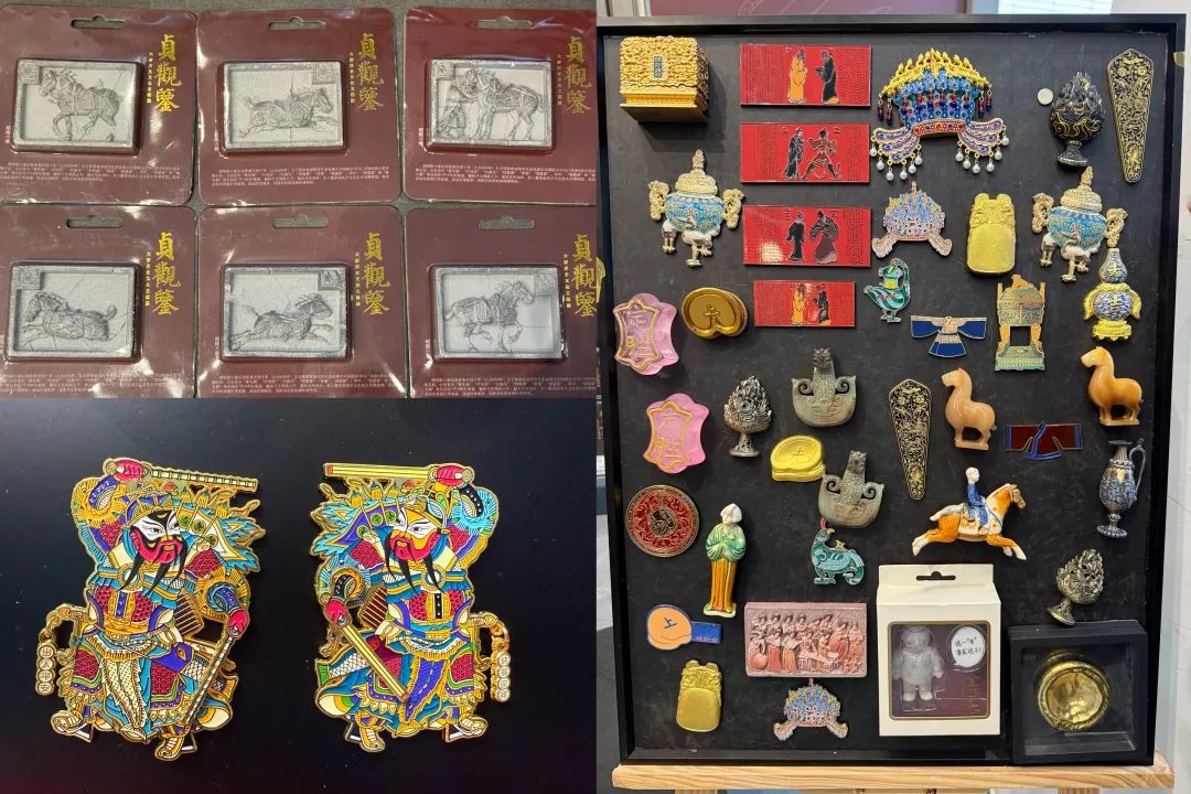 为丰富观展体验,闵博自主设计推出了20余款主题文创产品,包含明信片、冰箱贴、帆布包、徽章等。其中,与文物“葵边鸾兽铜镜”同款的文创铜镜将历史文化解读融入了文创之中,“有料亦有趣”;以昭陵六骏为原型的冰箱贴,蕴含着文物辗转的传奇故事;以李世民凌烟阁二十四功臣中的秦琼、尉迟敬德两位“门神”为形象的冰箱贴,也别具纪念意义。