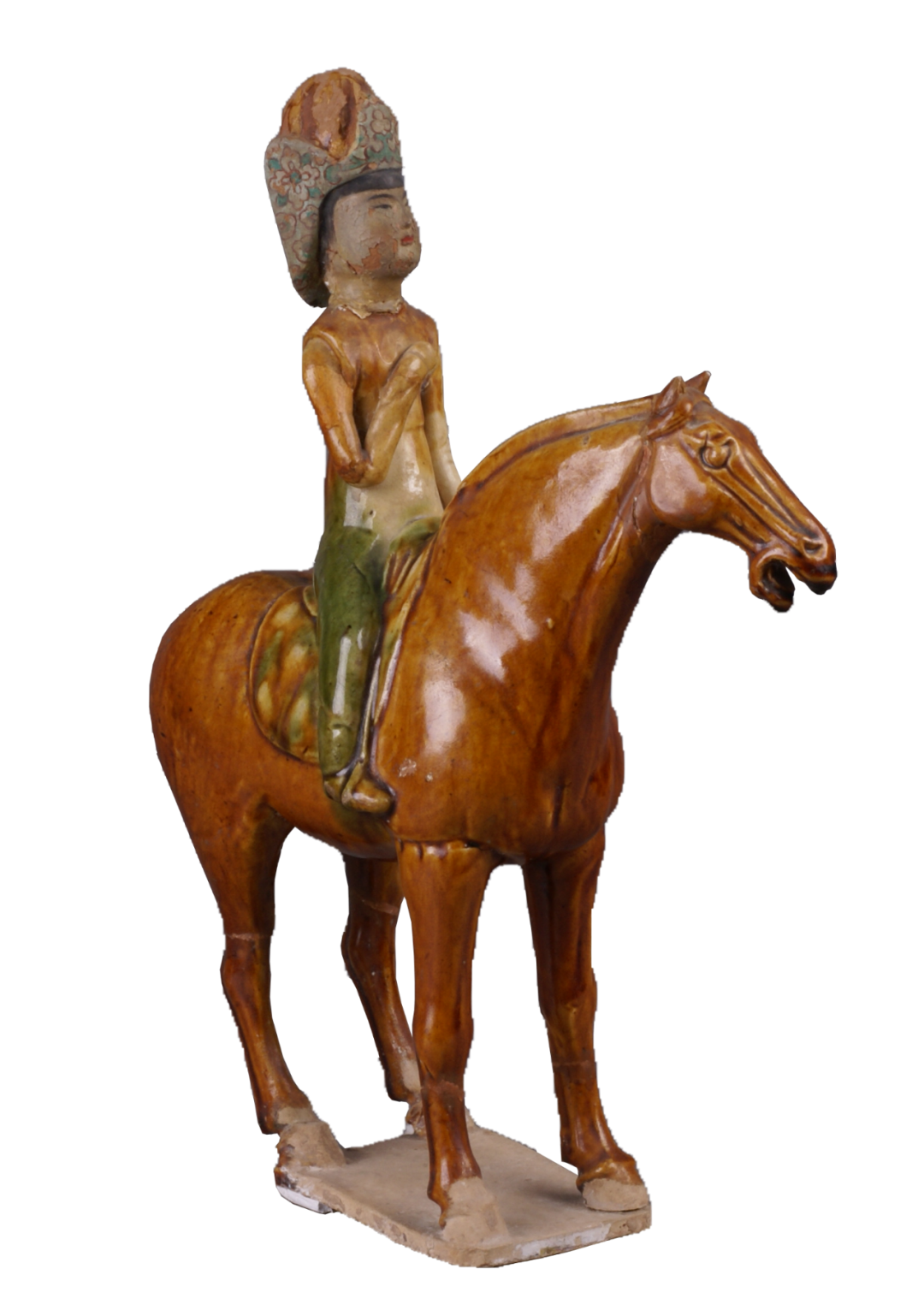 出土于李贤墓。女俑头戴饰有连枝梅花图案的翻檐胡帽,俑身为朱、黄、绿三彩相融。女俑眉清目秀,身材窈窕,着胡装,秀美之中平添了几分男子的潇洒与英挺,别有一番风韵,体现了强烈的时代感。雕塑家通过对大唐皇家贵妇形象的塑造,呈现了胡风盛行的社会风貌。