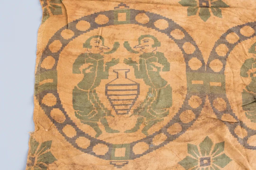 该锦组织为斜纹纬锦,残。两个团窠图案却保存完整。是一件以连珠作团窠,窠内两个罗马服饰人物,举角杯相对饮酒,两人之间有一个大酒坛。该种锦应属中原唐朝织造的织锦,对研究中西文化交流具有十分重要的意义。